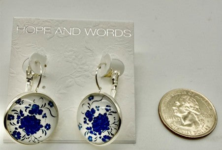 This pair of rhodium lever back earrings are adorned with a bouquet of blue flowers.